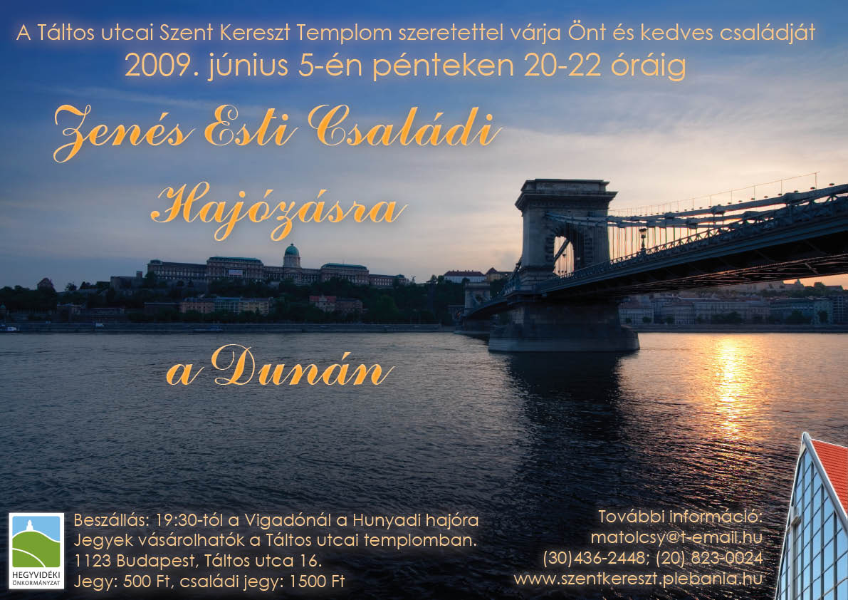 5-én, pénteken lesz az ez évi, tanévzáró, zenés, esti, családi sétahajózás a Dunán. Indulás: 20.00-kor a Vigadó térről, érkezés ugyanide kb. 22.00